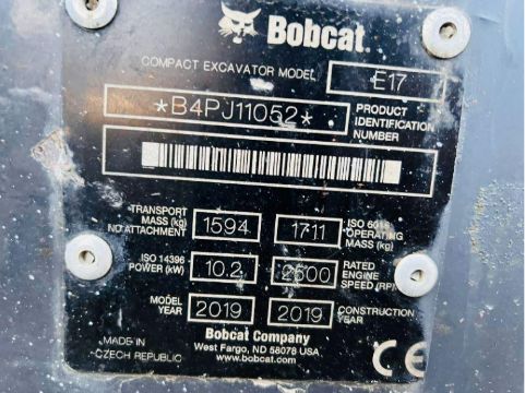 BOBCAT E17 TRACKED EXCAVATOR * YEAR 2019 , 2520 HOURS * C/W QUICK HITCH