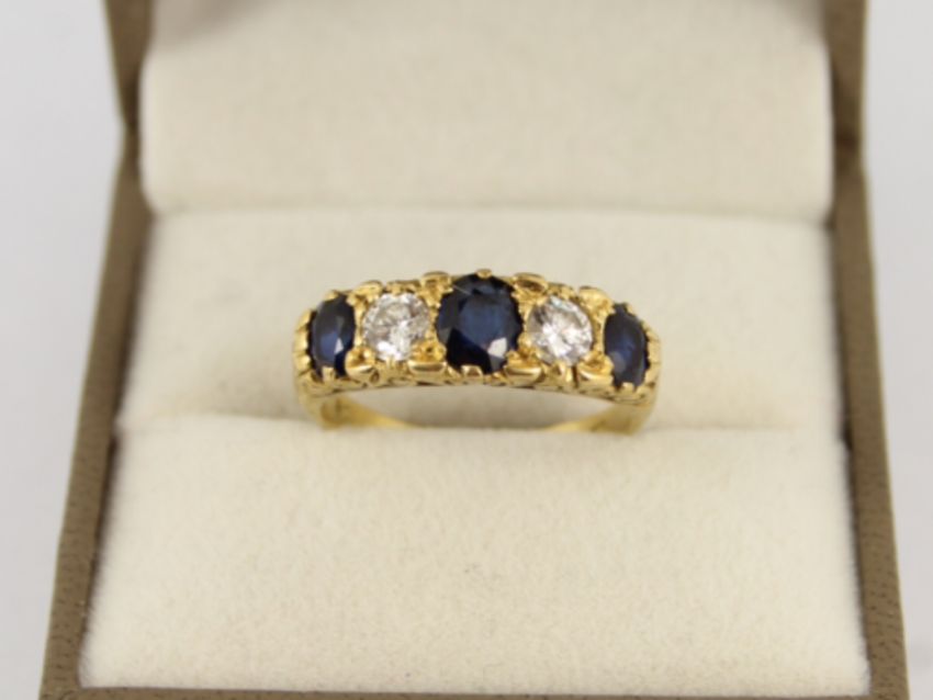 Here for sale, we have this magnificent vintage five stone ring. Three oval facet cut sapphires separated by two brilliant cut diamonds in a Victorian styled scrolling mount on a lovely 18ct yellow gold shank.