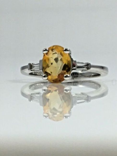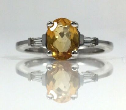 This wonderful Citrine Ring features a large Oval cut yellow Citrine with two natural baguette white diamonds on each side.