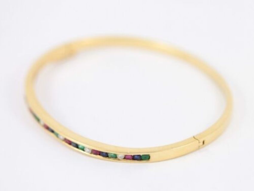 Here for sale we have this absolutely gorgeous ladies bangle, made from 18ct yellow gold and channel set with stunning diamonds, rubies, emeralds and sapphires.