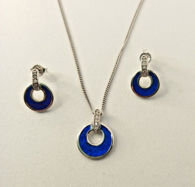 A beautiful Diamond & Ceramic Pendant and Earring set in Royal Blue. Comes with a 18" silver chain.