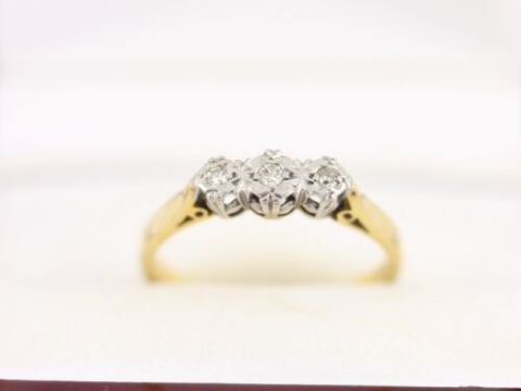 Here for sale we have this beautiful ladies trilogy ring, three stunning, clean and bright brilliant cut diamonds weighing a total of 0.10ct set in a lovely 18ct yellow gold shank.