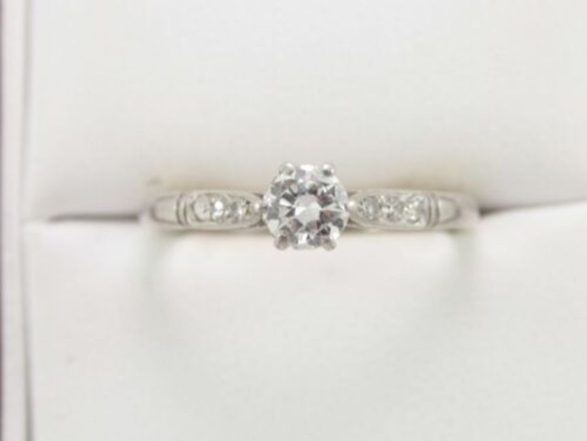 Here for sale we have this magnificent ladies solitaire ring, a gorgeous brilliant cut diamond flanked by three smaller diamonds on either shoulder of a lovely platinum shank. This ring would make an ideal gift for a loved one. Size: S Weight: 4.9 grams Total of approx 0.75ct of diamonds All diamonds are tested, 100% genuine.