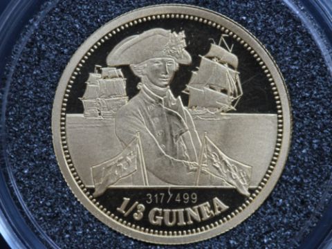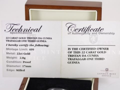 Here for sale we have this 2008 22 carat gold Tristan Da Cunha Trafalgar one third Guinea. Mintage: 499 Metal: 22ct Gold Weight: 2.8 grams Diameter: 17mm Edge: Milled Please take a look at our other items for sale. |