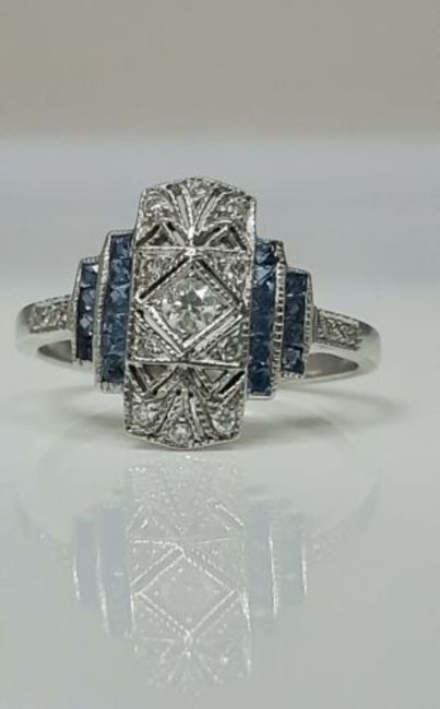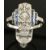 Art nouveau style dress ring. This unusual dress ring is in white gold and has ornate filigree art work holding 11 natural diamonds. Beautiful pale blue sapphires in two block on each side of the ring.