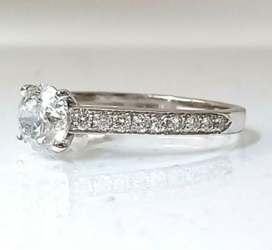 The show-stopping engagement ring features a 0.90 carat bright white brilliant cut diamond, classically four claw set setting. The ring is further embellished with 0.28carat brilliant cut diamonds to either side, creating a glistening array across the finger. This stunning brilliant-cut engagement ring has been beautifully crafted from 18-carat white gold. This dazzling ring is a jewellery piece that will be truly treasured forever making it the perfect engagement ring choice.