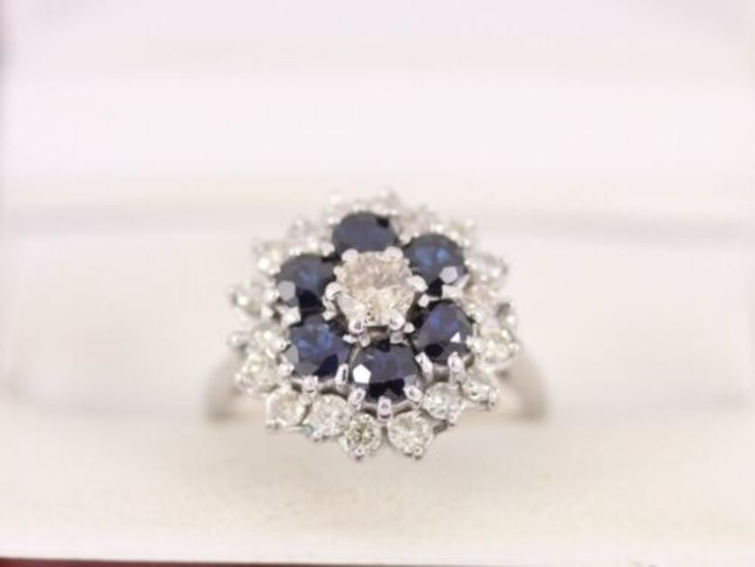 Here for sale we have this magnificent ladies halo ring, six gorgeous circular facet cut sapphires flanked by nineteen brilliant cut diamonds weighing a total of approx 0.86ct set on a lovely 18ct white gold shank.