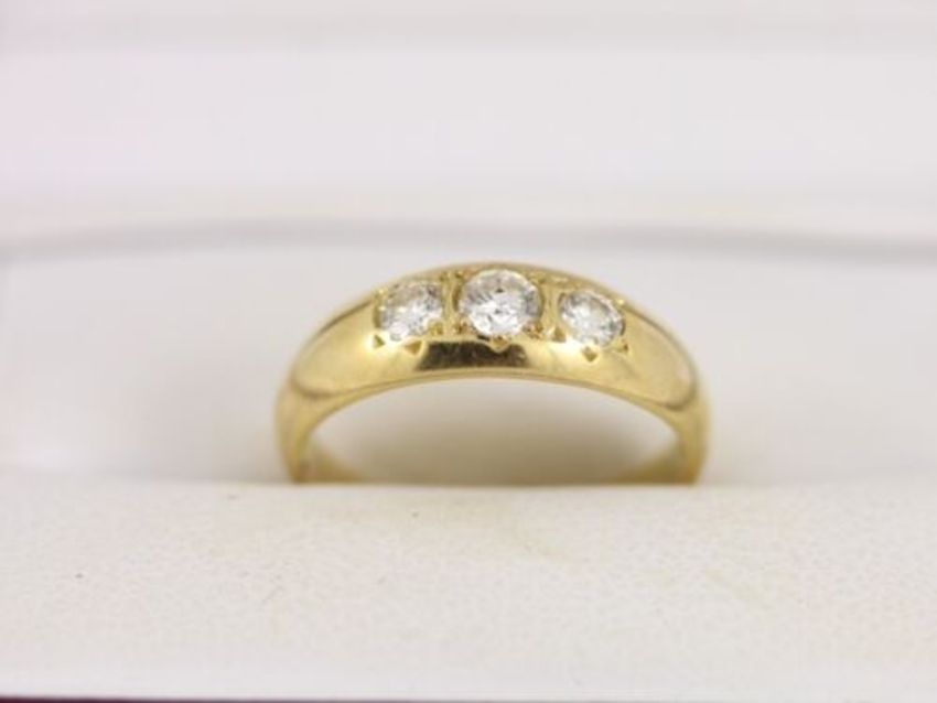 Here for sale we have this magnificent ladies trilogy ring, three stunning brilliant cut diamonds weighing a total of 0.25ct set in a lovely 18ct yellow gold shank. This ring would make an ideal gift for a loved one. Size: I Weight: 2.5 grams All diamonds are tested, 100% genuine.