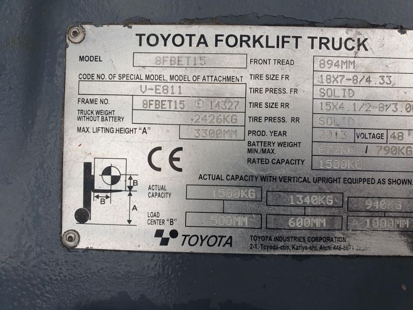 Toyota electric forklift, compact 3 wheeler.1500kg capacity..3300mm lift height. sideshift. Joystick control