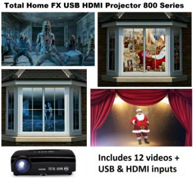 Total Home FX Special Effects Projector (800 Series HDMI) - Halloween, Christmas, festive, animated, window, home, decoration, video. Also projects your own choice of videos through USB and HDMI inputs.