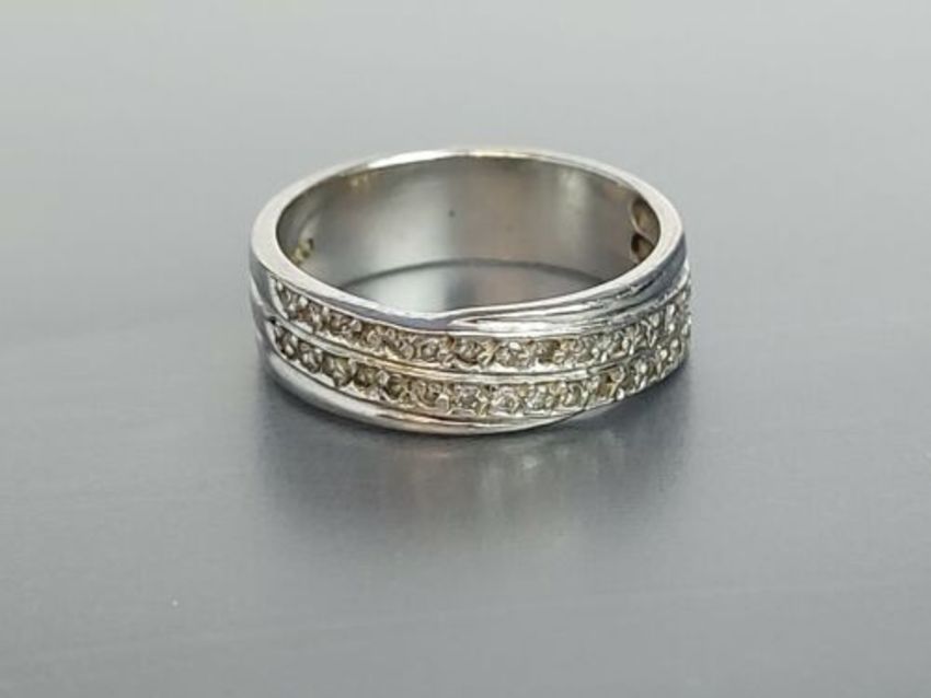 Here for sale, we have this magnificent crossover eternity ring. Thirty-five lovely little diamonds set in an 18ct white gold band.