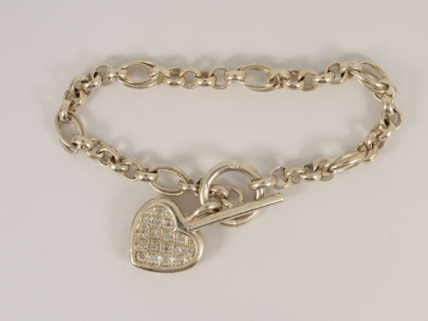 Here for sale we have this beautiful ladies bracelet made from sterling silver with a lovely heart shaped pendant set with CZ stones and a T bar fastening Weight: 19.7 grams Length: 7.25 Width: 8mm Heart measures: 17mm x 18mm |