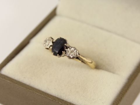 Here for sale, we have this magnificent ladies trilogy ring. A gorgeous oval facet cut sapphire flanked by two brilliant cut diamonds set on a lovely 18ct yellow gold shank.