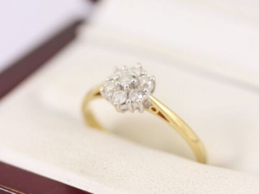 Here for sale we have this magnificent ladies cluster ring, seven brilliant cut diamonds weighing a total of 0.25ct set on a lovely 18ct yellow gold shank.
