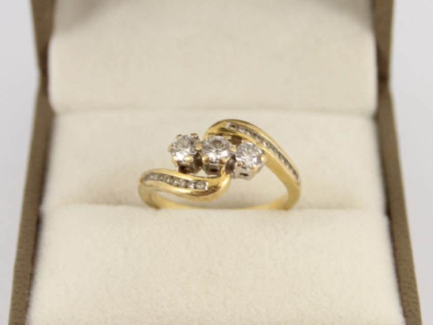 Here for sale, we have this magnificent ladies ring, three central diamonds set in an 18ct yellow gold crossover shank with smaller diamonds set in the shoulders This ring would make an ideal gift for a loved one. Size: L 1/2 Weight: 4 grams Head/setting height: 4.5mm Shank Width: 2mm Total of 0.50ct of diamonds All diamonds are tested, 100% genuine. . Please take a look at our other items for sale. Please note the boxes used in our pictures are for display purposes only and do not come with the items unless stated otherwise. |