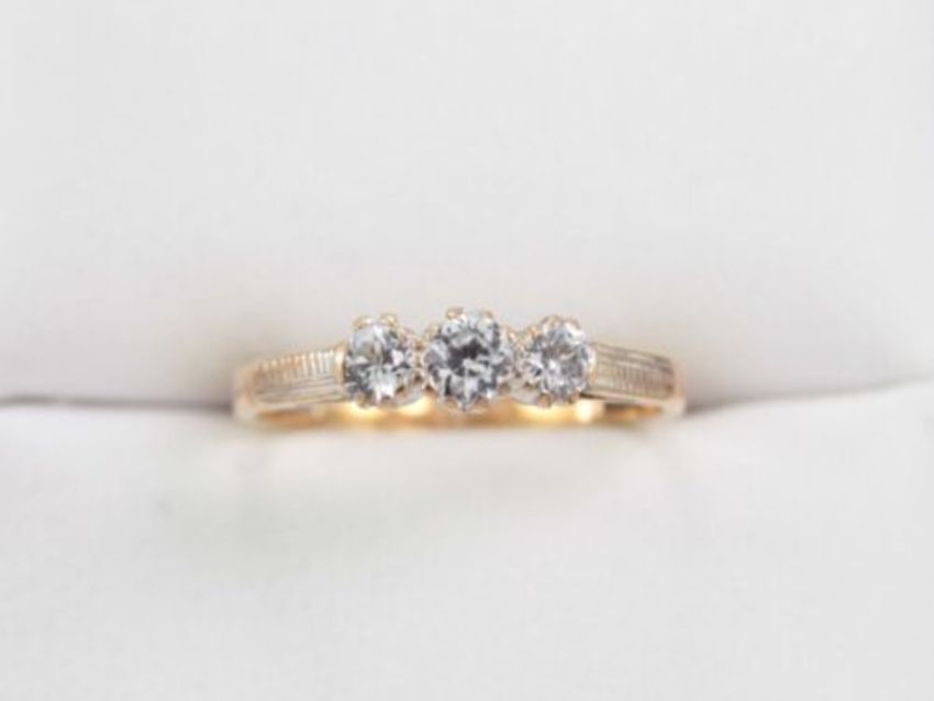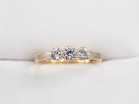 Here we have this stunning ladies three stone ring, three gorgeous brilliant cut diamonds weighing a total of approx 0.35ct on a 9ct yellow gold shank.
