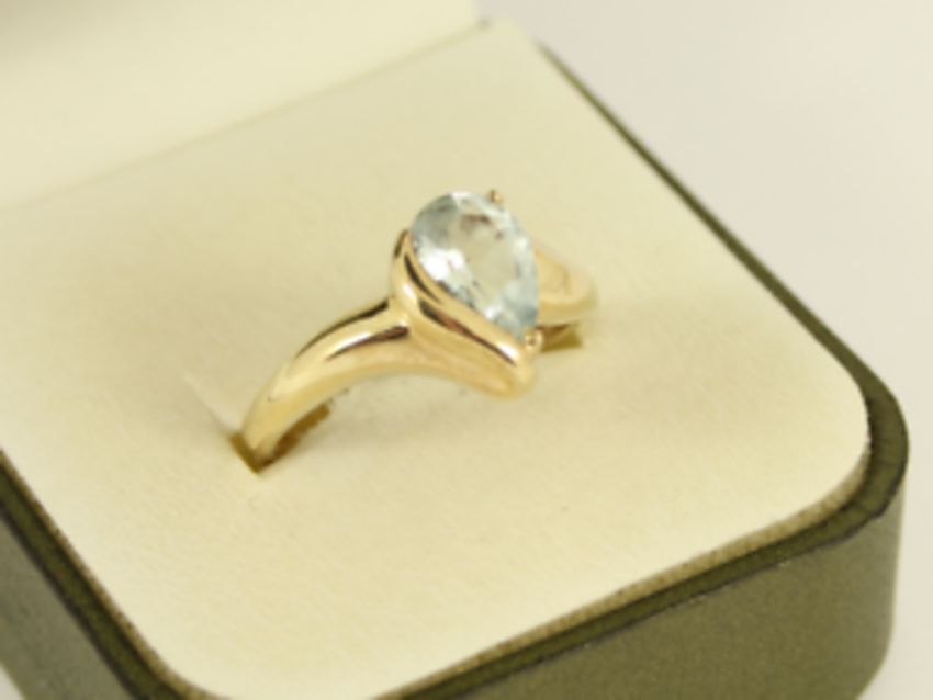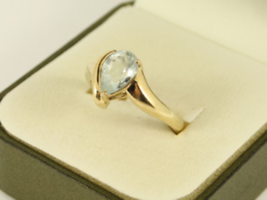Here for sale, we have this magnificent ladies solitaire ring. A gorgeous pear facet cut aquamarine set on a lovely 9ct yellow gold shank.