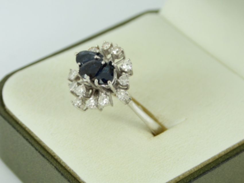 Here for sale, we have this magnificent ladies stunning cluster ring. Three pear facet cut sapphires surrounded by thirteen brilliant cut diamonds set on a lovely 18ct white gold shank.