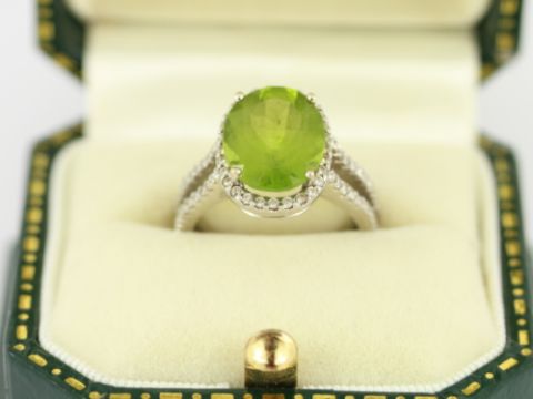 Here for sale, we have this magnificent ladies halo ring. A gorgeous oval facet cut peridot surrounded by by lovely brilliant cut diamonds on an 18ct white gold shank.