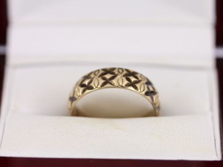 Here for sale we have this magnificent ladies vintage ring, made from 9ct yellow gold with a wonderful pattern around the outside of the band.