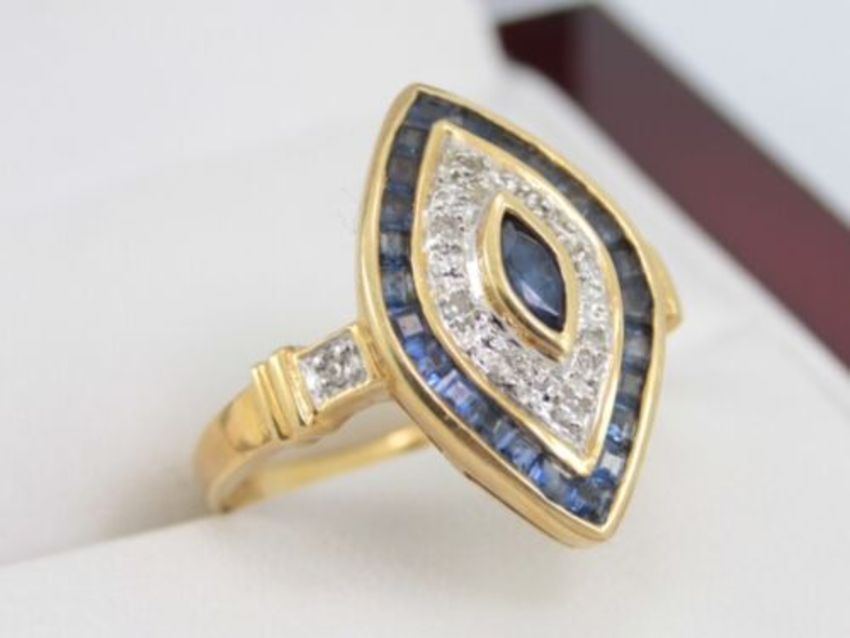 Here we have this stunning vintage ladies ring, the centre set with a gorgeous marquise cut sapphire stone surrounded by eight brilliant cut diamonds surrounded by a cluster of princess cut sapphire stones in a channel setting on an 18ct gold shank. This ring would make an ideal gift for a loved one. Size: N Weight: 5.3 Grams Head measures: 20mm x 12mm total of 0.10ct of diamonds All diamonds are tested, 100% genuine. |