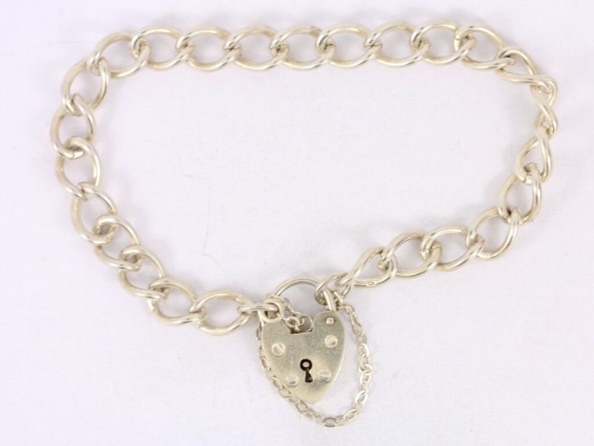 Here for sale we have this magnificent curb chain bracelet with heart padlock clasp, made from sterling silver.
