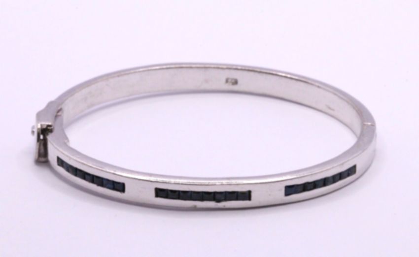 Here we have a splendid sterling silver bangle bracelet with simulated aquamarine gemstones.