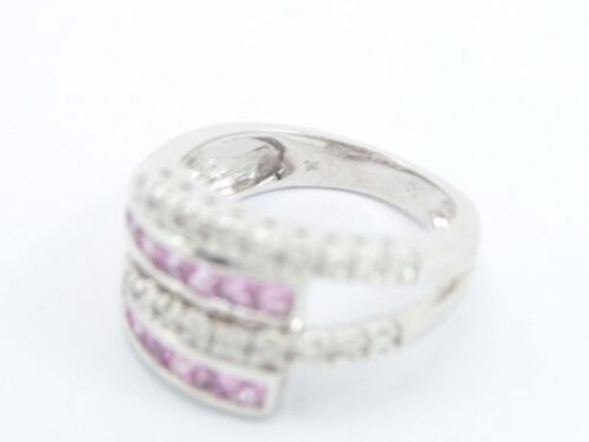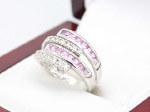 Here for sale we have this stunning ladies ring, two rows of nine beautiful diamonds weighing a total of approx 0.18ct flanked by two rows of gorgeous princess cut pink stones set on a lovely 9ct white gold shank.
