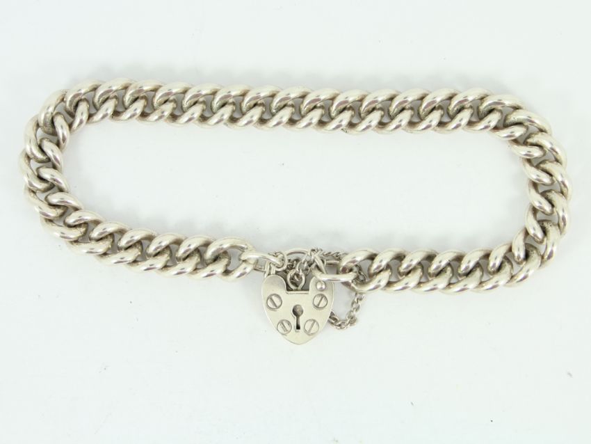 Here for sale we have this beautiful bracelet made from sterling silver with a heart padlock clasp. Weight: 27.4 grams Length: 7 inches Width: 8mm Padlock measures: 15mm x 12mm |