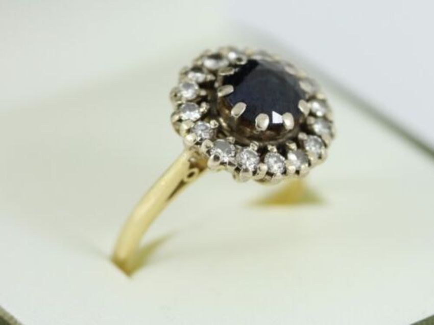 Here for sale we have this magnificent ladies halo ring, a stunning circular facet cut sapphire surrounded by sixteen brilliant cut diamonds weighing a total of approx 0.50ct on a lovely 18ct yellow gold shank.