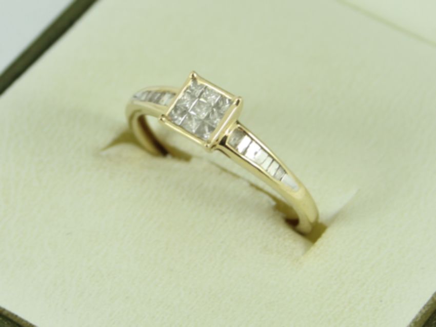 Here for sale, we have this magnificent ladies cluster ring. Nine princess cut diamonds set in the head flanked by seven baguette cuts diamonds set in either shoulder on a lovely 9ct yellow gold shank.