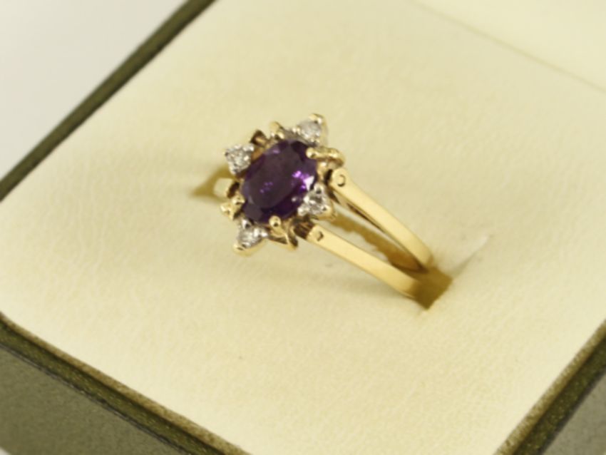 Here for sale, we have this magnificent ladies 14K yellow gold swivel head ring. One side features a diamond cluster head containing fifteen brilliant cut diamonds and a the other side containing an oval facet cut amethyst flanked by four brilliant cut diamonds..