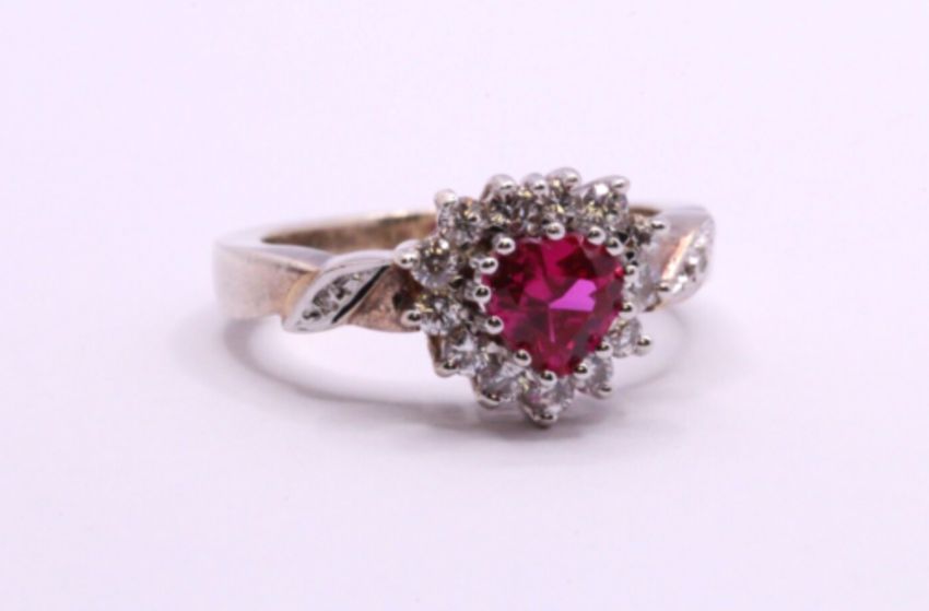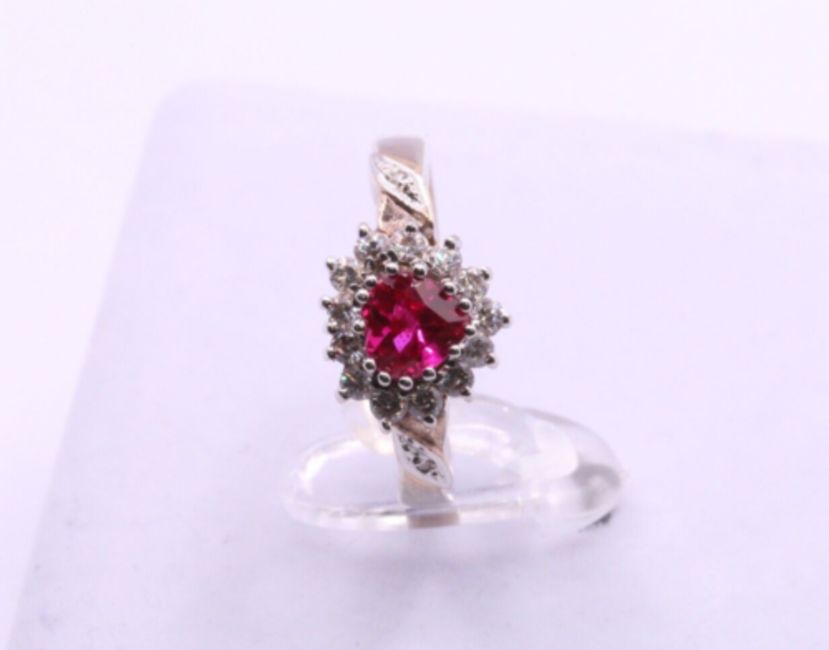 Here we have a stunning Sterling silver ring with a sparkling simulated Ruby gemstone centre & simulated diamonds cluster.