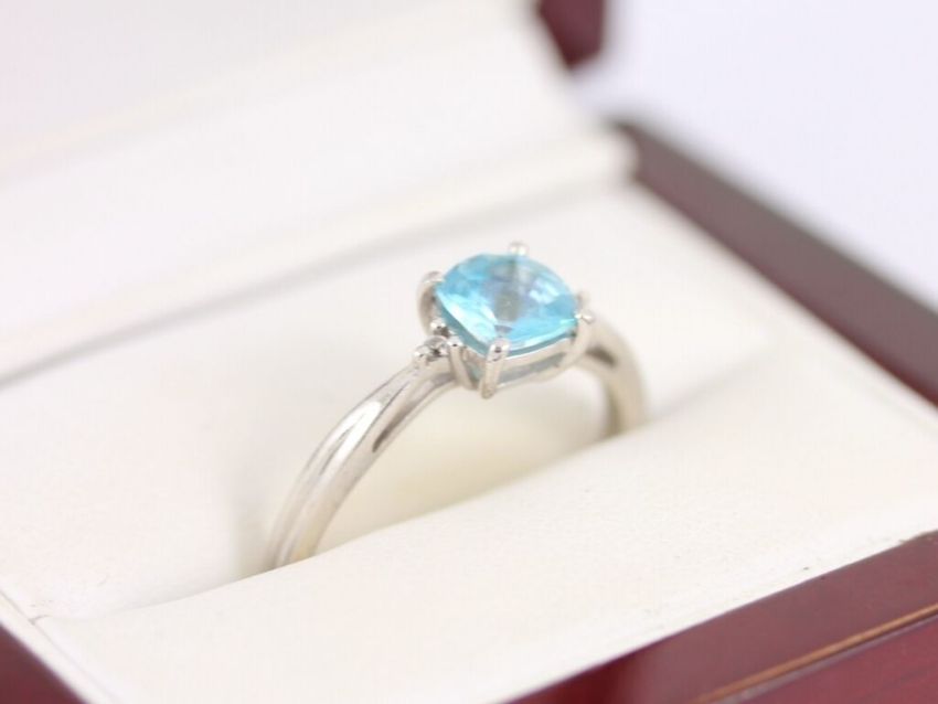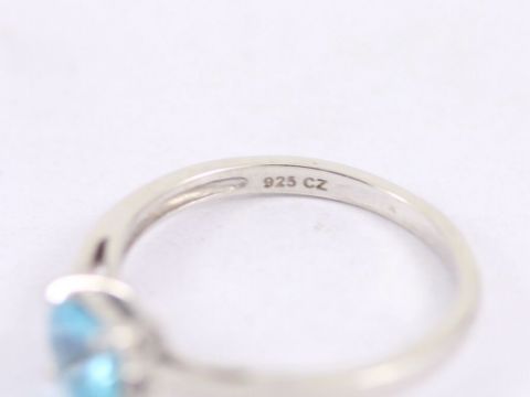Here for sale we have this beautiful ring, made from sterling silver with a gorgeous style and set with a lovely synthetic blue topaz flanked by a CZ stone on either side.