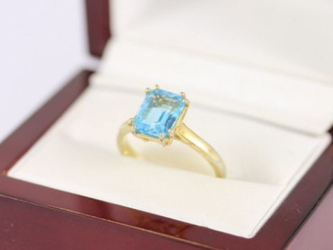 Here for sale we have this beautiful ring, made from gold overlaid sterling silver with a gorgeous style and set with a lovely emerald facet cut synthetic aquamarine.