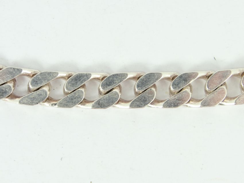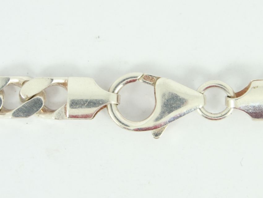 Here for sale we have this gent's curb chain bracelet made from sterling silver. Weight: 17.2 grams Length: 8.5 inches Width: 7mm |