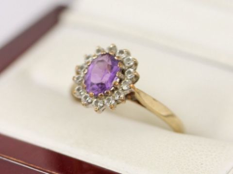 Here for sale we have this magnificent ladies ring, a gorgeous oval facet cut amethyst surrounded by fourteen CZ stones set on a lovely 9ct yellow gold shank.