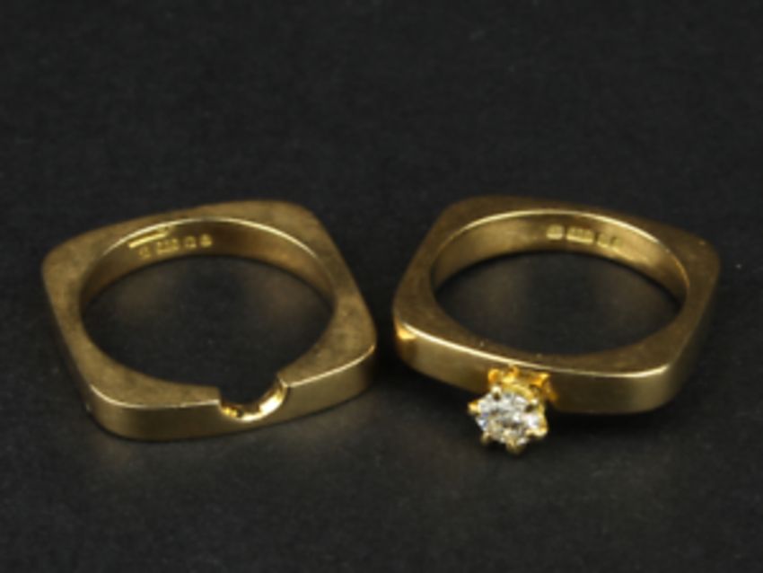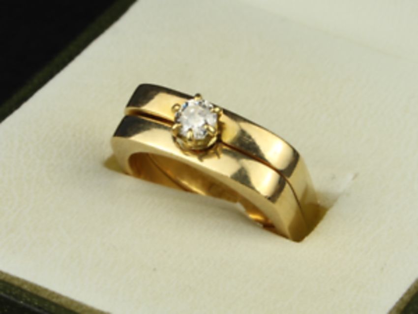Here for sale, we have this magnificent wedding band and solitaire engagement ring set. Both rings have a squared shape and are made from 14K yellow gold, the engagement ring is set with a lovely 0.25ct brilliant cut diamond. The wedding band has a cutaway section to allow the solitaire ring to sit perfectly next to it.