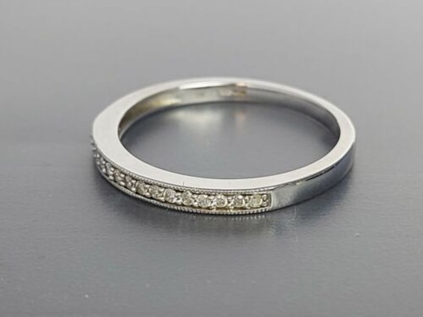 Here for sale, we have this magnificent ladies half eternity ring. Sixteen brilliant cut diamonds set in a lovely 9ct white gold band. This ring would make an ideal gift for a loved one. Size: S Weight: 2.3 grams Shank Width: 2mm Total of 0.12ct of diamonds. All diamonds are tested, 100% genuine.