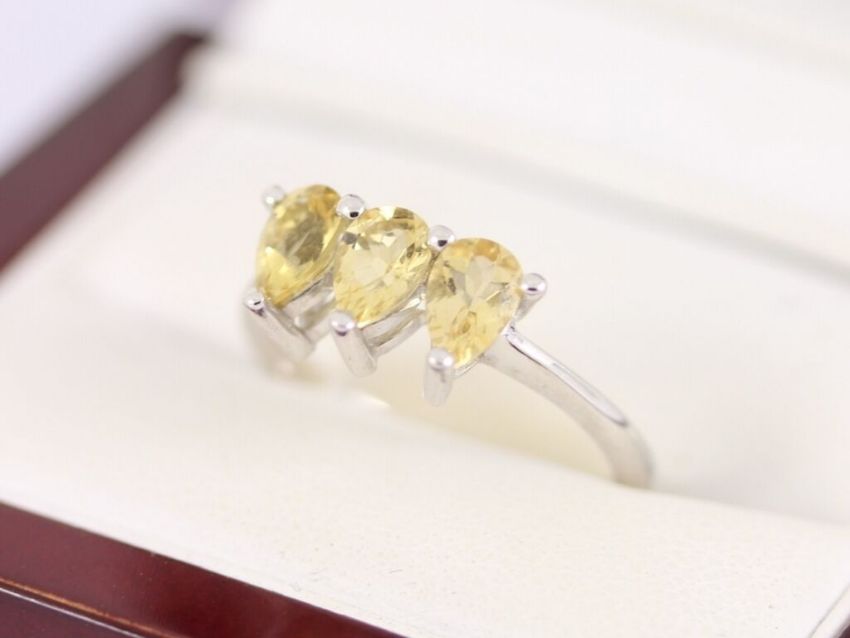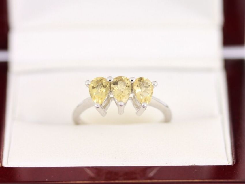 Here for sale we have this beautiful ring, made from sterling silver with a gorgeous style and set with three lovely pear cut synthetic citrines.