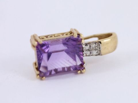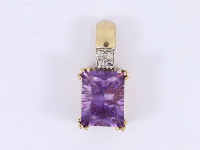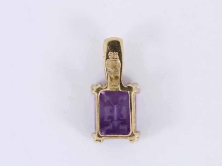 Here for sale we have this gorgeous ladies pendant made from 9ct yellow gold and set with a beautiful emerald facet cut amethyst with two diamonds in the bale.