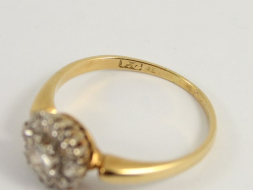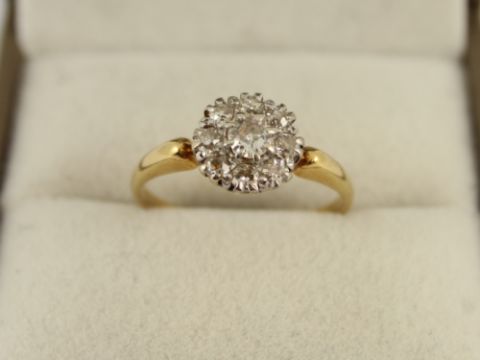 Here for sale, we have this magnificent ladies cluster ring. A brilliant cut diamonds surrounded by eight smaller brilliant cut diamonds set on a lovely 18ct yellow gold shank.