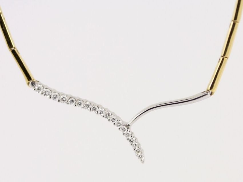 Here for sale we have this gorgeous ladies necklace, made from 18ct white and yellow gold and set with eighteen stunning brilliant cut diamonds.