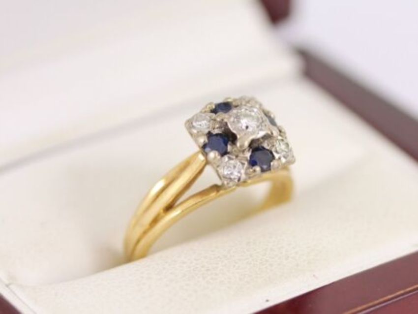 Here for sale we have this magnificent ladies ring, five brilliant cut diamonds flanked by four circular facet cut sapphires set on a lovely 18ct yellow gold shank.