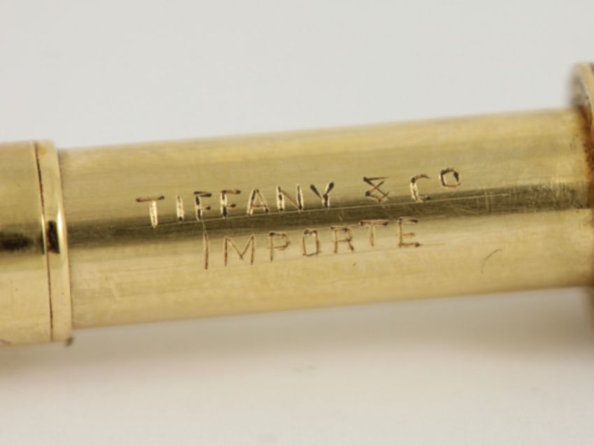 Here for sale, we have this magnificent rare vintage Tiffany & Co retractible pencil. This beautiful piece is crafted from 18ct yellow gold and features a gorgeous ruby set at one end surrounded by lovely old cut diamonds weighing a total of 1.25ct. Measures: 41mm in length in holder, 85mm when fully extended. width of pencil is 7mm, the diameter of the end with stones is 10mm. Weight: 21.7 grams Please take a look at our other items for sale. |