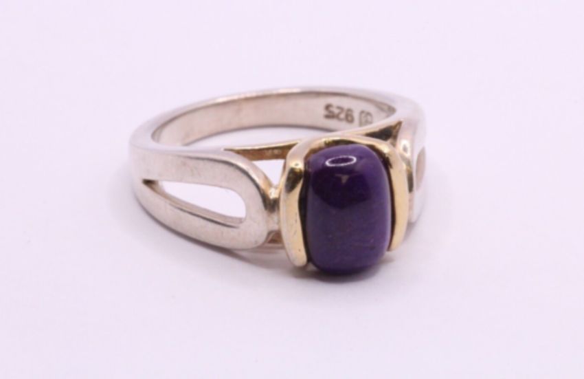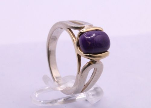 Here we have a stunning sterling silver ring with Gold plating and a splendid Stichtite gemstone.