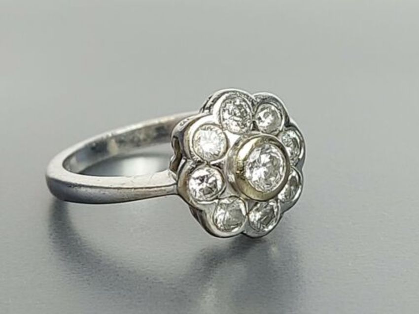 Here for sale, we have this absolutely stunning cluster ring. Nine glistening brilliant cut diamonds in a daisy style setting on an 18ct white gold shank.