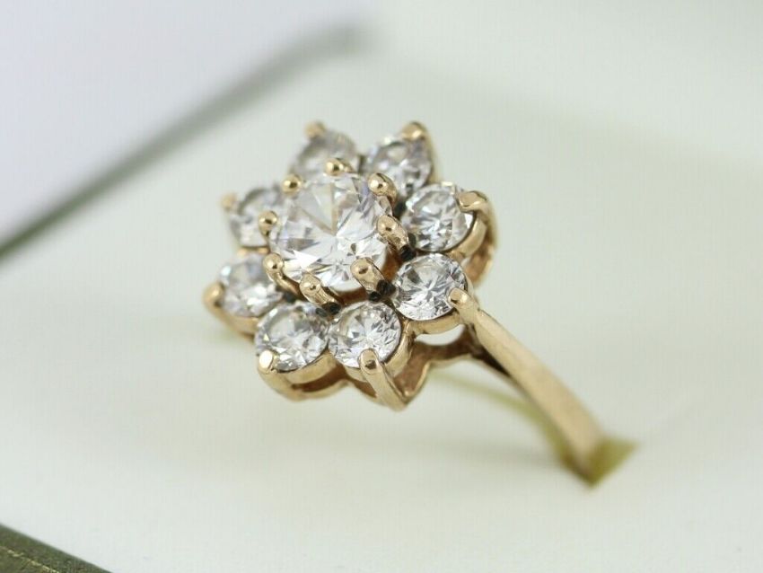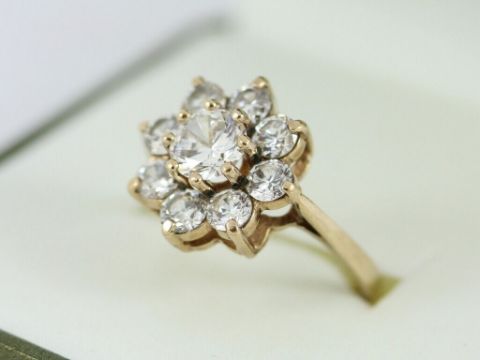 Here for sale we have this magnificent ladies cluster ring, a central CZ stone surrounded by eight smaller CZ stones set on a lovely 9ct yellow gold shank.