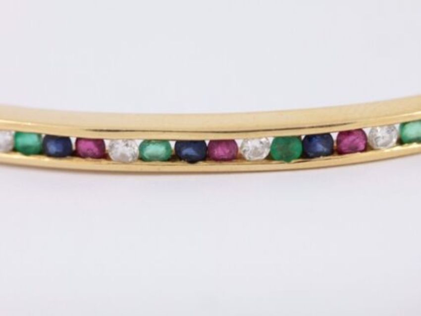 Here for sale we have this absolutely gorgeous ladies bangle, made from 18ct yellow gold and channel set with stunning diamonds, rubies, emeralds and sapphires.