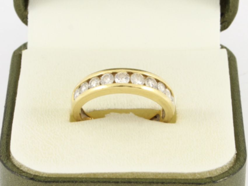 Here for sale, we have this magnificent ladies half eternity ring. Ten brilliant cut diamonds weighing a total of 1ct channel set in a lovely 18ct yellow gold band.